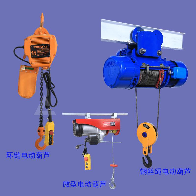 鋼絲繩電動葫蘆分為CD1單速型、MD1雙速型、防爆電動葫蘆等規格型號,這類鋼絲繩電動葫蘆的起重量一般是0.5噸-80噸,起升高度在3米-30米之間,單雙速鋼絲繩電動葫蘆可以單獨進行作業,還可以和手動或者電動小車配合使用,在起重機的梁上進行作業。微型電動葫蘆額定載重是0.1噸-1噸,體積比較小,攜帶方便,多用于家庭裝修、 空調安裝等作業。